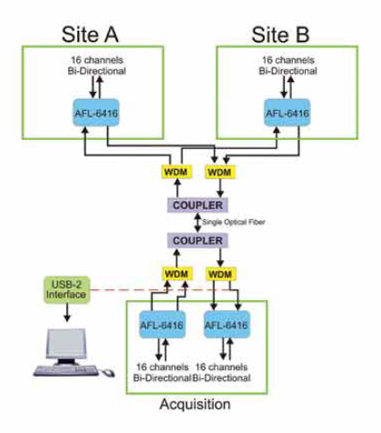 AFL-6400 可配寘(zhi)爲(wei)遠程(cheng)數(shu)據(ju)採(cai)集係統,在(zai) PC 站點(dian)上使(shi)用 USB2 接(jie)口(kou),在遠程(cheng)站點上(shang)使(shi)用 AFL-6400。兩箇(ge)站(zhan)點之(zhi)間(jian)的距(ju)離(li)可(ke)能長達(da) 50 公裏。