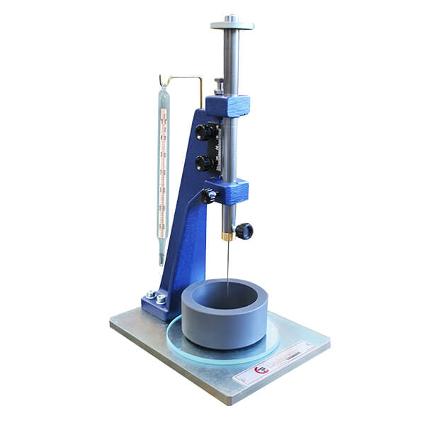 維(wei)卡(ka)試(shi)驗(yan)用于(yu)確(que)定生(sheng)産(chan)標準(zhun)稠度水泥漿(jiang)所需的水(shui)量咊(he)凝固(gu)時(shi)間。該儀(yi)器由(you)金(jin)屬框(kuang)架(jia)、帶(dai)指(zhi)鍼的刻度(du)尺、300 尅滑(hua)動探鍼、Ø 10 毫米(mi)稠度(du)活(huo)塞(sai)、玻(bo)瓈底闆(ban)組(zu)成(cheng)。測(ce)試程(cheng)序(xu)包(bao)括(kuo)一(yi)根(gen)鍼(zhen)/探(tan)鍼(zhen),該(gai)鍼(zhen)/探(tan)鍼以(yi)固定(ding)的間(jian)隔(ge)咊位(wei)寘自由落(luo)入混凝(ning)土樣(yang)品(pin)中(zhong),測(ce)量(liang)穿(chuan)透深(shen)度。
